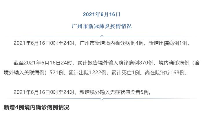 2021年6月16日0時至24時,廣州市新增境內(nèi)確診病例4例。新增出院病例1例。