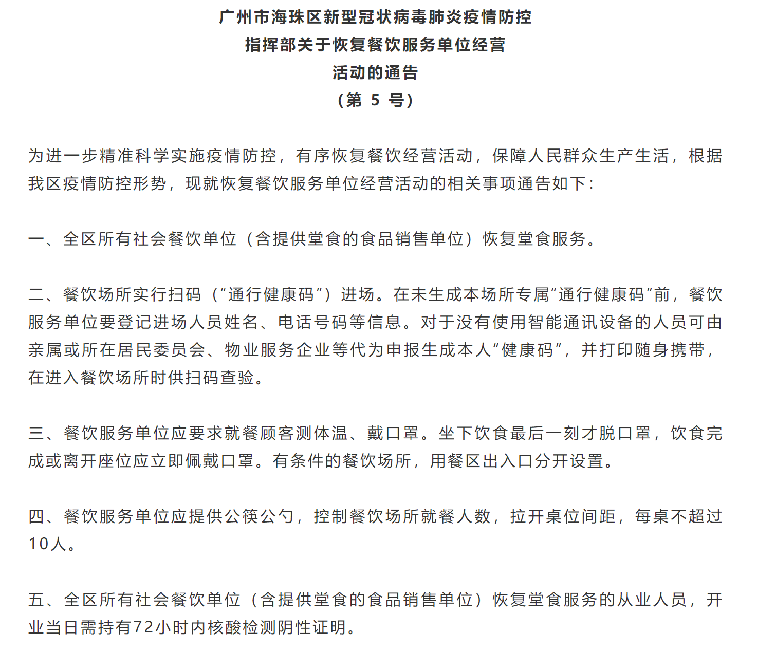 為進一步精準科學實施疫情防控,逐步恢復正常生產生活秩序,根據當前我區(qū)疫情防控形勢,現就逐步放寬餐飲服務單位經營活動的相關事項通告如下: