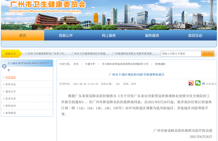 央廣網(wǎng)廣州6月26日消息(記者 張勝?gòu)?qiáng))6月26日下午,廣州市衛(wèi)健委先后發(fā)布《廣州市個(gè)別區(qū)域疫情風(fēng)險(xiǎn)等級(jí)調(diào)整的通告》和《廣州市部分區(qū)域疫情風(fēng)險(xiǎn)等級(jí)調(diào)整的通告》。據(jù)通報(bào),南沙區(qū)、荔灣區(qū)、白云區(qū)的四個(gè)區(qū)域調(diào)整為低風(fēng)險(xiǎn)地區(qū)。目前廣州全市中風(fēng)險(xiǎn)地區(qū)清零。