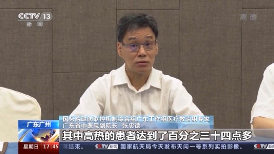 國務(wù)院聯(lián)防聯(lián)控機(jī)制綜合組廣東工作組醫(yī)療救治組專家、廣東省中醫(yī)院副院長 張忠德:本輪廣州疫情中高熱、發(fā)燒的病人特別多,我們統(tǒng)計了一下,166個病人之中,發(fā)熱的病人達(dá)到了百分之八十多,其中高熱的患者達(dá)到了百分之三十四點多,所以就對我們的治療帶來了挑戰(zhàn)。我們還發(fā)現(xiàn)患者從普通型向重癥轉(zhuǎn)變的時間很短,以前我們在其他地方看了可能是7天,可能9天,有些是第10天,這里有些第3、4、5天就轉(zhuǎn)變過去了,所以治療上就要求我們采取的措施要更果斷。