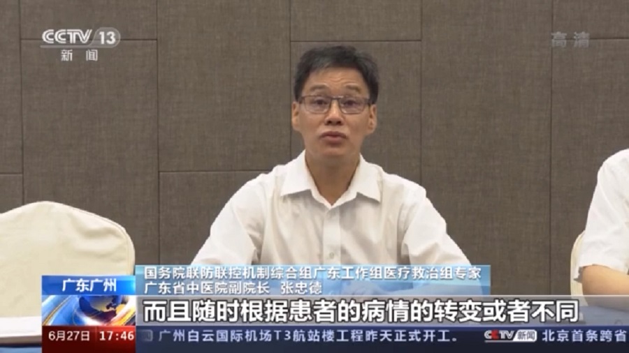 國務(wù)院聯(lián)防聯(lián)控機(jī)制綜合組廣東工作組醫(yī)療救治組專家、廣東省中醫(yī)院副院長 張忠德:在危重癥跟重癥患者中,我們始終堅持現(xiàn)代醫(yī)學(xué)的一些救治手段,呼吸機(jī),ECMO,心電監(jiān)測,氣管鏡這些治療的同時,用中醫(yī)藥排毒,我們對每一個重病人跟危重病人都采用了一些中西醫(yī)協(xié)同治療方法,而且隨時根據(jù)患者的病情的轉(zhuǎn)變或者不同,隨時進(jìn)行調(diào)整,才取得現(xiàn)在這樣階段性的重大成果。