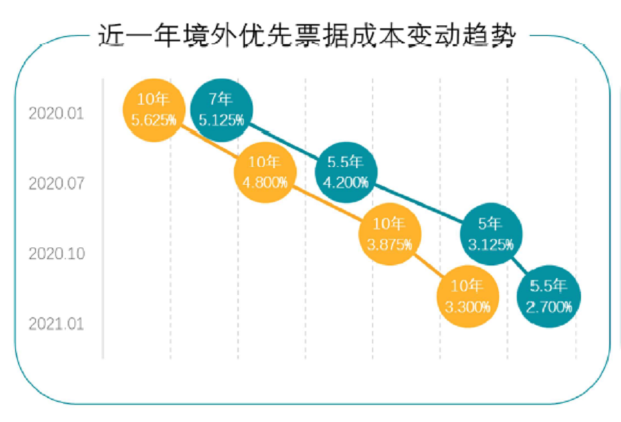 報(bào)告期末,碧桂園的平均融資成本為5.56%,較2019年底下降78個(gè)基點(diǎn)。2021年1月發(fā)行的5億美元5.5年期票據(jù)和7億美元10年期票據(jù)的利率更是分別為2.7%、3.3%,創(chuàng)民營(yíng)房企發(fā)債融資成本之新低。在行業(yè)整體融資趨緊的背景下,碧桂園以超低成本發(fā)債融資,充分顯示集團(tuán)穩(wěn)健的財(cái)務(wù)盤(pán)面在資本市場(chǎng)上擁有的競(jìng)爭(zhēng)實(shí)力。