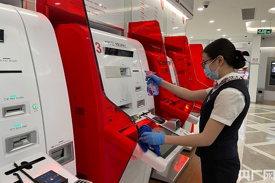 工商銀行廣州分行某網(wǎng)點(diǎn),工作人員正在消毒營(yíng)業(yè)廳設(shè)備。(央廣網(wǎng)發(fā) 通訊員供圖)