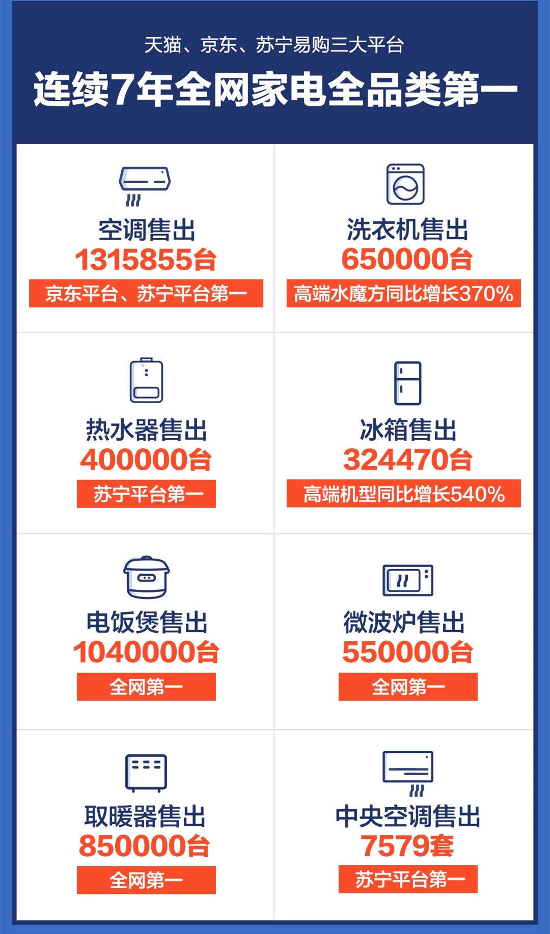 從細(xì)分品類(lèi)看,單項(xiàng)“賽場(chǎng)”成績(jī)依舊亮眼:電飯煲、微波爐、取暖器三大品類(lèi)均位居全網(wǎng)第一;熱水器和中央空調(diào)兩大品類(lèi)均在蘇寧平臺(tái)銷(xiāo)售第一;空調(diào)銷(xiāo)售量達(dá)到131.58多萬(wàn)臺(tái),在京東平臺(tái)和蘇寧平臺(tái)上排名第一。