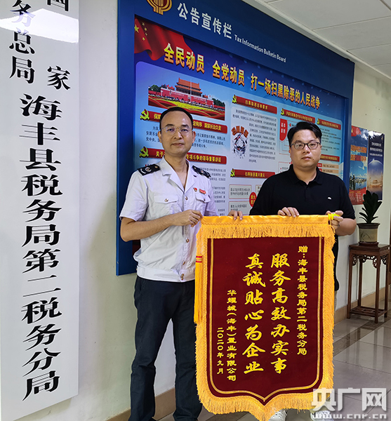 央廣網(wǎng)汕尾10月26日消息(記者官文清 通訊員陳思宇 童振躍)“海豐稅務(wù)人員主動(dòng)上門指導(dǎo)留抵退稅事宜,僅用兩天時(shí)間退稅款就到我們賬戶了,真金白銀落袋,為我們解決了復(fù)工后資金周轉(zhuǎn)的實(shí)際困難。”近日,華耀城(海豐)置業(yè)有限公司將一面印有“服務(wù)高效辦實(shí)事,真誠貼心為企業(yè)”的錦旗送至海豐縣稅務(wù)局第二稅務(wù)分局,對稅務(wù)人員真誠貼心、全面提速為企業(yè)排憂解難的服務(wù)表示充分肯定及衷心感謝。