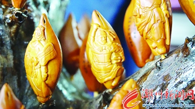 “核雕是一門減法藝術,制作核雕,要經(jīng)歷選料、構圖、打型、細雕、磨磋等十余道工序,工藝繁瑣,做工考究,每道工序都馬虎不得!痹卩嵙紭秀@研了近十年的工作臺上,一盞燈、一臺放大鏡、一枚欖核、數(shù)十把刻刀……通過刻、撥、挑、鉆、削等多種技法雕刻,一個個其貌不揚的烏欖核,在他的手中成了一件件精美的藝術品。