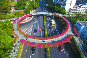 天橋綠化以簕杜鵑為主,此外還有黃蟬、蔓馬纓丹、希茉莉、龍吐珠等十多種植物,尤其在陽光不足地段,灰莉、綠籮、紅背桂就派上用場了。