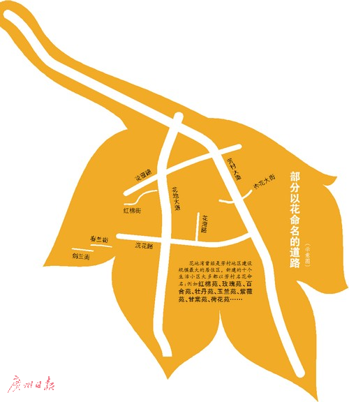 根據(jù)不完全統(tǒng)計(jì),芳村土地上以花命名的超過十個(gè),涉及地名如芳村、花地,河流名字花地河,道路主干道芳村大道浣花路、百花路等,小巷子名字紅棉街、劍蘭街、春蘭街、鷹爪樹街、杏花大街等,深深地蘊(yùn)含著千年花卉文化的秘密。