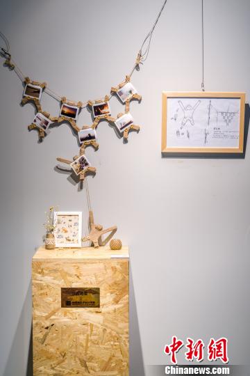 參展作品《攀·回憶》,從猴子撈月的故事里得到啟發(fā),用廢舊棉麻布料做成的照片墻相框。 王謹 攝