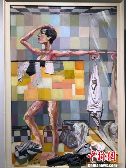 參展作品《女人的衣柜里永遠缺一件衣服》將廢舊衣物融入油畫創(chuàng)作而成!⊥踔 攝