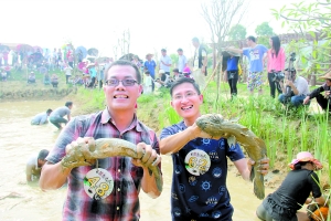 在昨天舉行的萬人抓魚大賽中,捕魚“勇士”與數(shù)十斤的大魚搏斗,驚險刺激;顒咏Y(jié)束后,游客紛紛與自己抓到的大魚合影,最重的大魚超過40斤。
