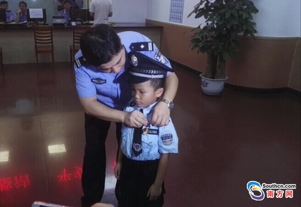 來自夢守護公益中心的胡彬彬了解到小煒豪的情況后,一直希望能幫他在手術(shù)前“圓夢”。通過廣州許多志愿者中心,她們輾轉(zhuǎn)聯(lián)系上廣州市公安局海珠區(qū)分局。就在9月2日下午,海珠區(qū)公安分局南華西派出所決定幫助小煒豪實現(xiàn)他的警察夢。
