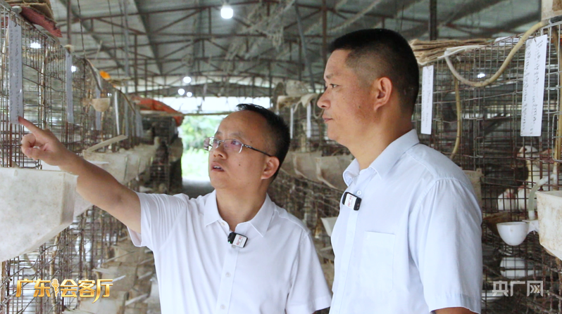 陳偉波(左)與養(yǎng)鴿戶探討興寧鴿養(yǎng)殖情況(央廣網(wǎng)記者 張順鵬 攝)