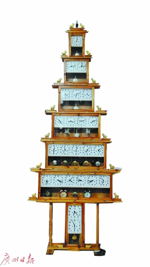 除了購買收購鐘表外,家祥叔還能自己創(chuàng)新,自己設計、制作出新式鐘表,有“一砣兩表”、“兩砣一表”、圣誕樹鐘、四面鐘等。 “一砣兩表”是一個鐘擺能帶動兩座鐘表,“兩砣一表”是兩個鐘擺帶動一座鐘表,四面鐘則是一個鐘擺能帶動東南西北四座鐘表。圣誕樹鐘是多個鐘表從下往上摞起來,高約5米,像一棵圣誕樹的形狀,中間一個擺舵就可以同時帶動顯示悉尼、北京、雅加達等多個國家時間的鐘表,這是老人家2015年花了75天的時間獨自制作而成的“得意之作”。