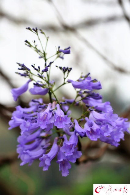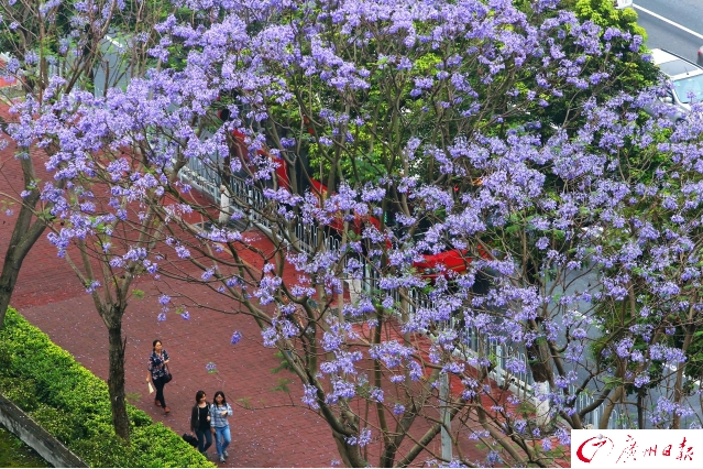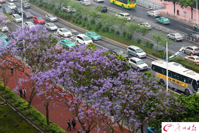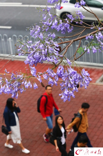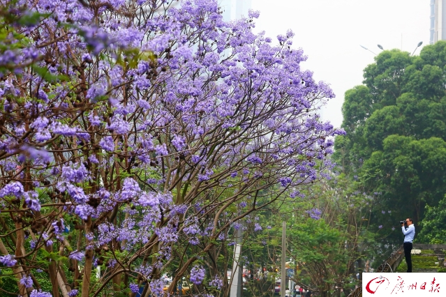據(jù)廣州日?qǐng)?bào)報(bào)道:記者在黃埔大道看到,不少行人都被路兩旁樹梢上一團(tuán)團(tuán)淡紫色的“云朵”吸引,紛紛駐足拍照。淡紫色的花朵像一簇簇小鈴鐺掛在樹冠上,配上與含羞草相似的葉子,格外令人賞心悅目。“這兩年很多公眾號(hào)都做藍(lán)花楹賞花指南,每逢開花,很多人都會(huì)過來拍照,”暨南大學(xué)大三的吳同學(xué)說。