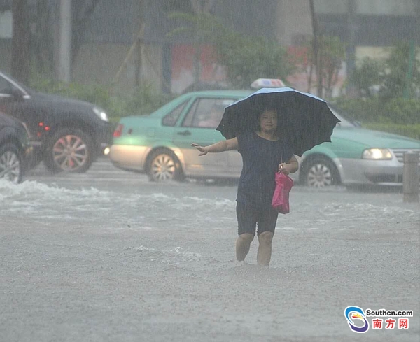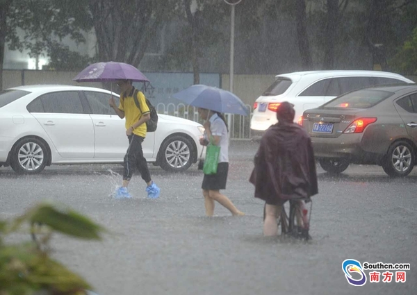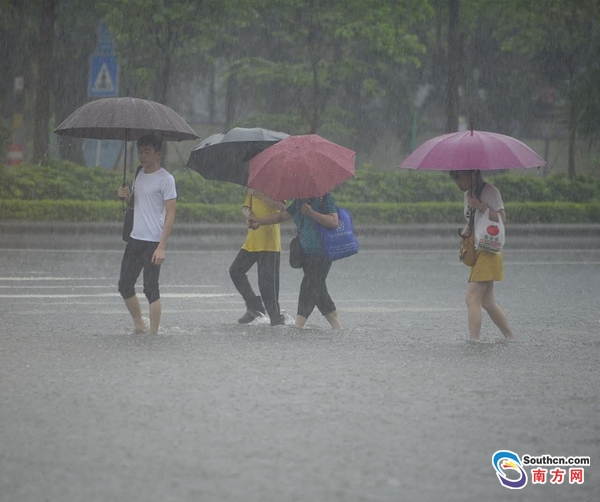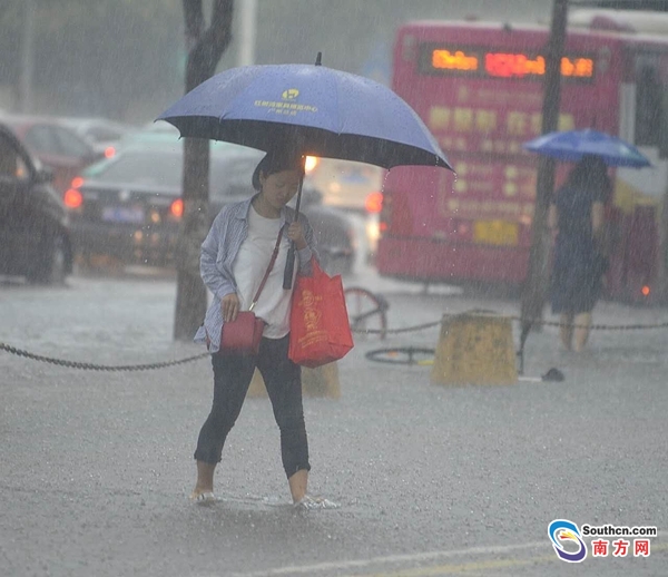 24日早晨,廣州雷鳴閃電,暴雨如注,導致天河區(qū)黃埔大道東與桃園東路水浸街,汪洋一片,行人卷起褲子在水中前行。 南方日報記者 肖雄 攝影報道