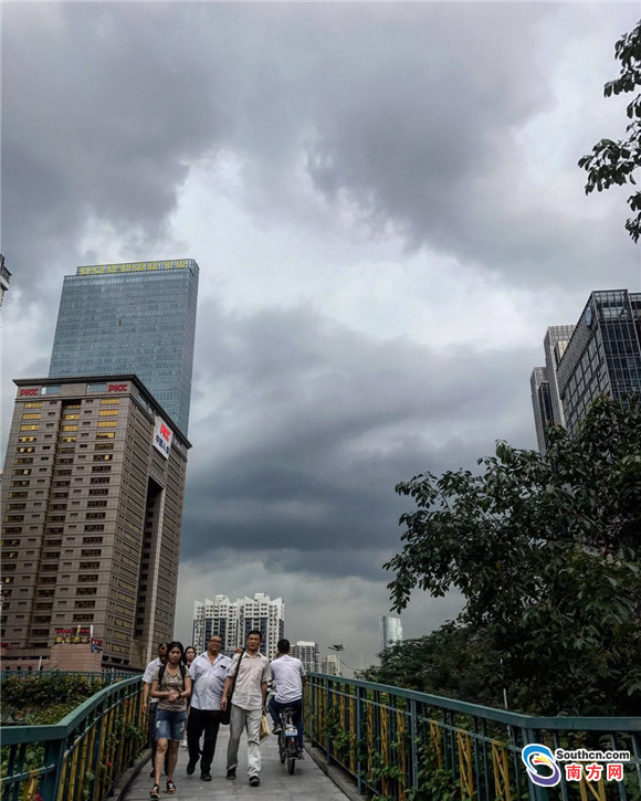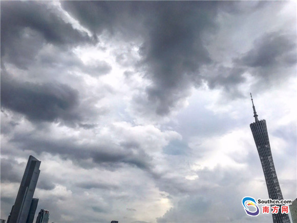 南方網(wǎng)訊 21日下午三點(diǎn),廣州烏云雷雨滾滾而來(lái),廣州市區(qū)瞬間被雨霧籠罩。