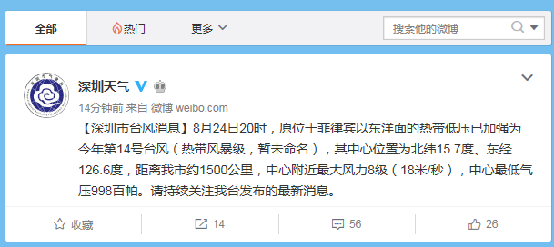 據(jù)深圳天氣微博消息,臺風(fēng)“天鴿”剛走,又有一個新的熱帶低壓在菲律賓以東洋面生成,該熱帶低壓24日17時距離深圳1586公里。