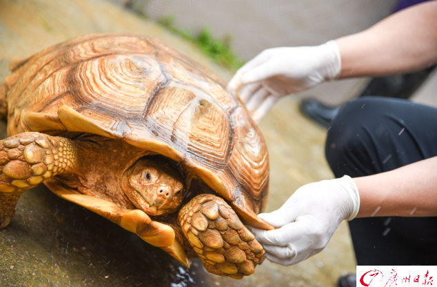 長途跋涉后,蘇卡達陸龜跟廣州的朋友們露個臉。廣州日報全媒體記者陳憂子攝