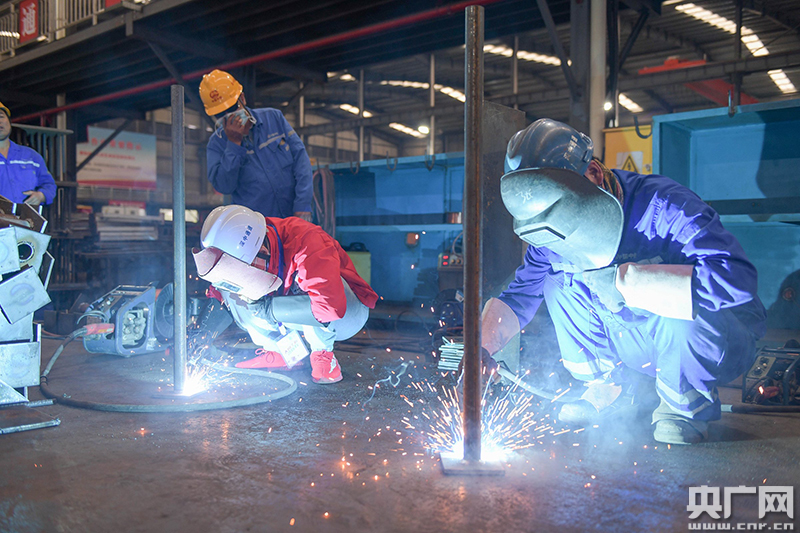 “技能國(guó)手”與一線產(chǎn)業(yè)工人進(jìn)行焊接比拼。(央廣網(wǎng)記者 官文清攝)