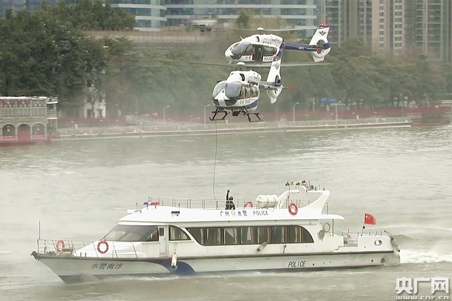 特警落船的一瞬間,博得現(xiàn)場觀眾的陣陣掌聲。這是廣州公安水空綜合演練的一幕,模擬珠江上一艘船艇出現(xiàn)被劫持的突發(fā)狀況,廣州特警索降安全解救人質(zhì)的場景。
