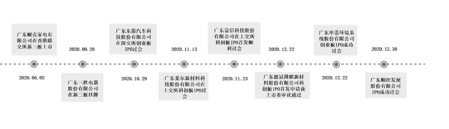 順德2020年8家新增境內(nèi)外上市(含過會)企業(yè)時(shí)間線。(央廣網(wǎng)記者 夏燕 制圖)