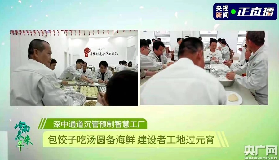 直播當日適逢元宵佳節(jié),深中通道的許多建設者都選擇了就地過年。在工地上,建設者們一起包餃子、吃湯圓……各樣的娛樂休閑活動,讓年味依舊灑滿了食堂。