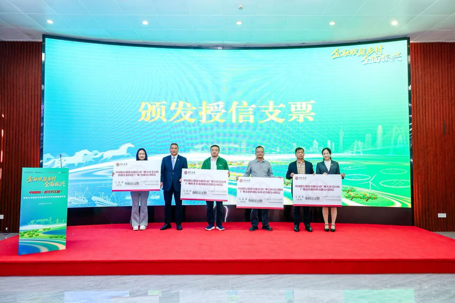 在首批銀企授信支票環(huán)節(jié),中行廣州天河支行現(xiàn)場(chǎng)為鴻樾農(nóng)業(yè)科技(廣州)有限公司、廣州鮮多多食材配送有限公司、廣州農(nóng)聯(lián)科創(chuàng)信息技術(shù)有限公司、廣州達(dá)智新材料有限公司的企業(yè)代表頒發(fā)授信支票,以實(shí)打?qū)嵉摹罢娼鸢足y”為農(nóng)業(yè)科技企業(yè)發(fā)展注入強(qiáng)勁動(dòng)力。