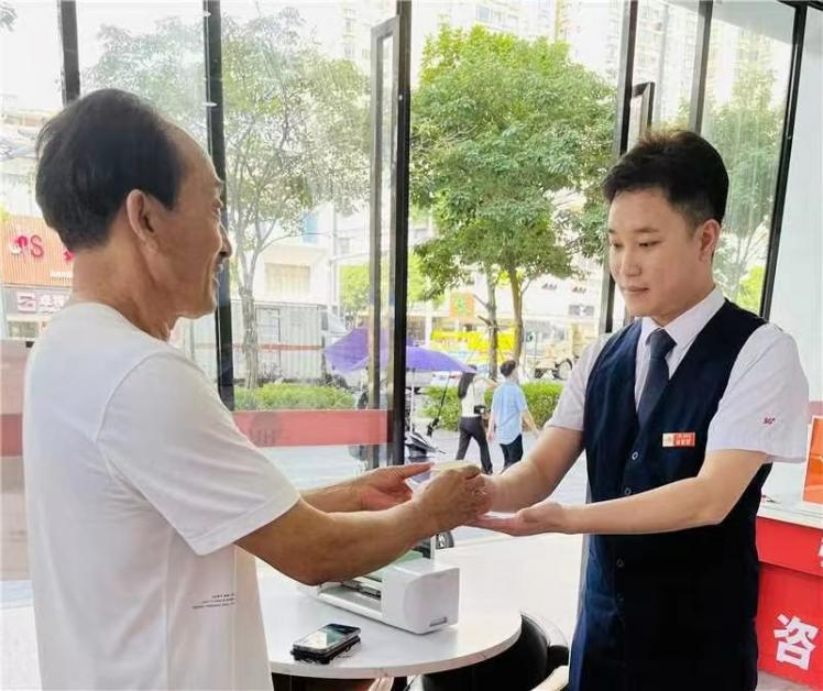 深圳福田聯通大廈營業(yè)廳里,一位坐輪椅的老人前來辦理業(yè)務,營業(yè)員蕭惠蓉立刻起身,半蹲在老人身旁,耐心講解、一步步演示,讓原本復雜的業(yè)務辦理變得輕松順暢。