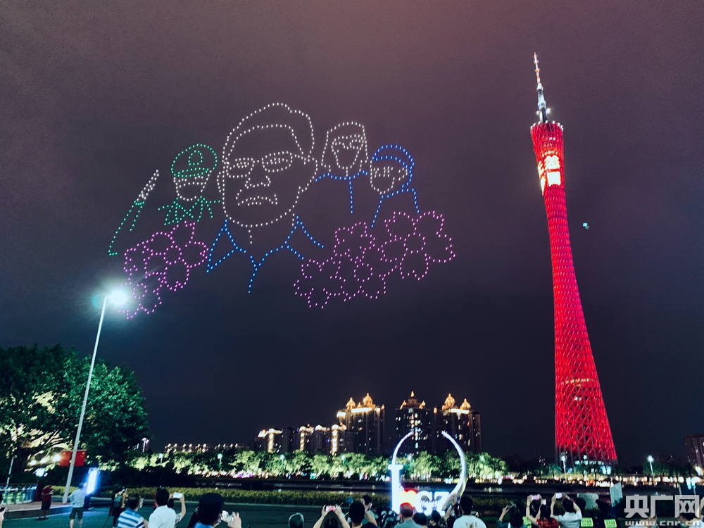 千架無人機致敬戰(zhàn)疫英雄,慶燈光秀刷亮廣州夜空。(央廣記者 周羽攝)