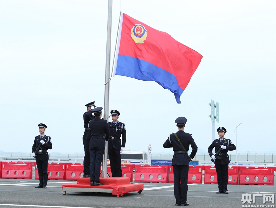 “向警旗敬禮!”全體民警神情莊重,整齊敬禮,飽含真摯情感,齊唱警歌,表達(dá)著對黨對祖國對人民的無限忠誠和熱愛。紅藍(lán)相間的人民警察警旗緩緩升起,在海天一色的港珠澳大橋上空獵獵飄揚(yáng),格外耀眼。