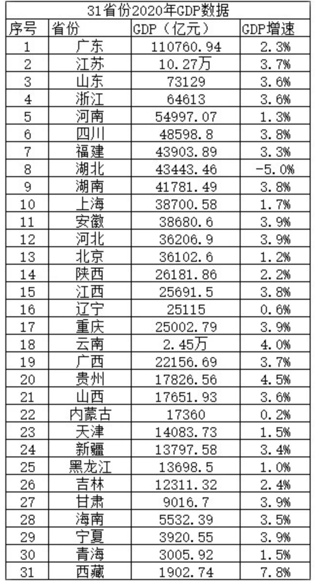 2020年,廣東省地區(qū)生產(chǎn)總值超過11萬億元,連續(xù)32年領(lǐng)跑全國,增速2.3%。江蘇省經(jīng)濟(jì)總量首次跨過10萬億門檻,達(dá)到10.27萬億元,但增速高于廣東,達(dá)到3.7%。山東省以7.3萬億的總量繼續(xù)名列第三,增速3.6%。