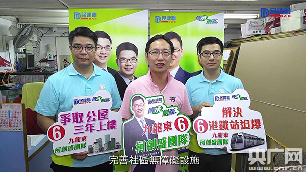 柯:其實(shí)這個(gè)口號(hào)就能很好的表現(xiàn)出兩個(gè)狀況的。第一個(gè)就是反映出民建聯(lián)是一個(gè)能夠給年輕人多點(diǎn)嘗試參與政治機(jī)會(huì)的政黨。我們希望通過“有年輕,有干勁”這種想法,向議會(huì)注入新的動(dòng)力。讓九東的市民知道年輕人是有能力,能夠擔(dān)當(dāng)起政治工作。第二句創(chuàng)新為九東,是因?yàn)榫琵垨|面臨著很多老大難的問題,我們交通擁堵問題,長(zhǎng)者人口多,貧窮問題嚴(yán)重,房屋問題備受關(guān)注。所以我們能夠希望通過新的思維,讓政府關(guān)注我們九龍東,所以就想到這個(gè)口號(hào)了。