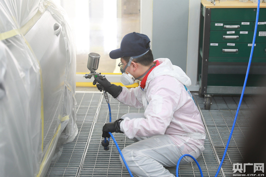 當(dāng)?shù)弥袡C會到工廠現(xiàn)場噴漆后,他特意帶上了參賽時的工裝和工具。盡管在一線實操,與之前在教學(xué)場景有很大差異,但從調(diào)色到噴涂,王濤扎實的基本功還是贏得了老師傅們的一致肯定。