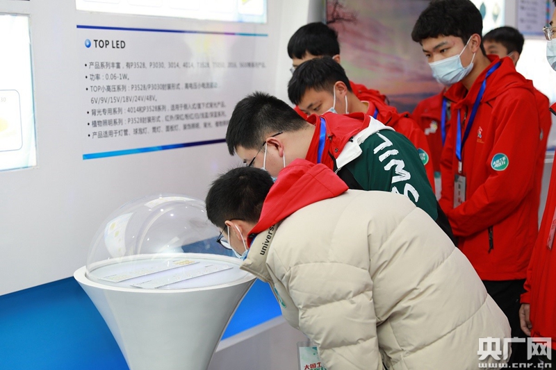 國(guó)賽選手們近距離觀察LED產(chǎn)品。(央廣網(wǎng)發(fā))