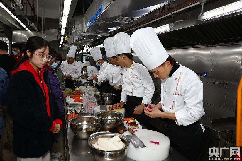 國賽選手在順德廚師學院課堂了解雕花技藝。(央廣網(wǎng)發(fā))