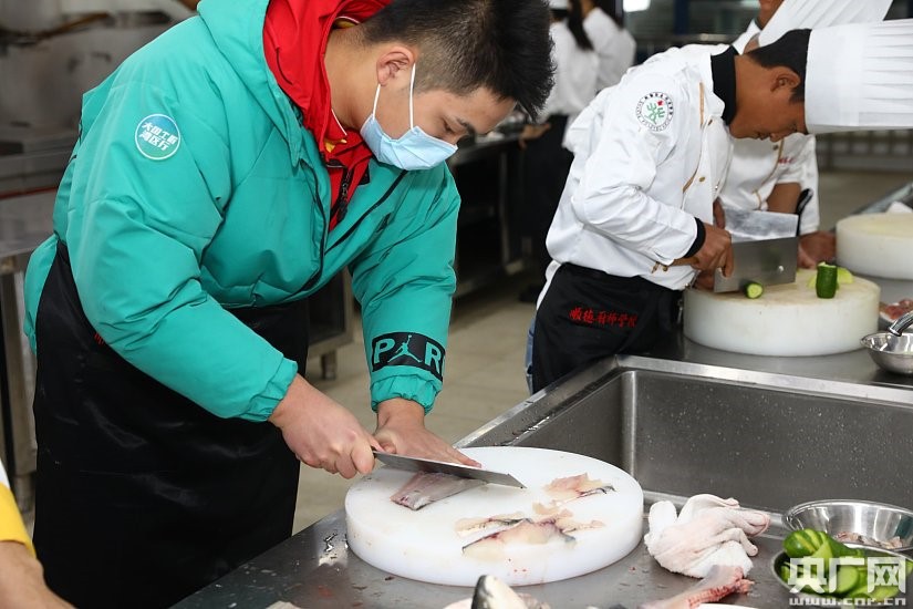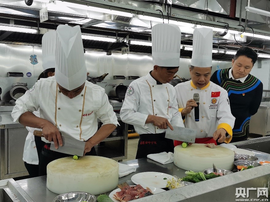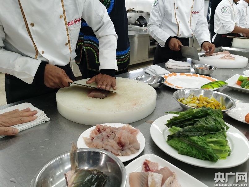國賽選手楊東升與彝族學員同臺PK片魚刀工。(央廣網(wǎng)發(fā))