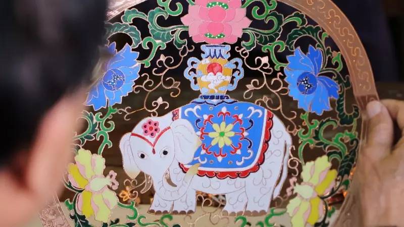 銅鑿剪紙就將薄似紙的銅箔一疊疊起來(lái),再用鑿的珠刀,一點(diǎn)一點(diǎn)地將剪紙的圖案鑿出來(lái),鑿?fù)曛辄c(diǎn)以后,再根據(jù)圖案不同的形象填上不同的色彩。