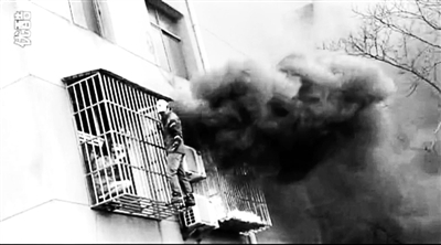 在這條10分鐘左右的視頻中,一棟居民樓中的一間屋子著火,火苗已躥出窗外,并伴有大量黑煙。在著火屋子的隔壁房間,一名女子站在陽(yáng)臺(tái)防盜網(wǎng)里等待救援。而在防盜網(wǎng)外,一名身穿紅色外套、頭戴白色帽子的男子,沿著防盜網(wǎng)之間的空隙慢慢移動(dòng),試圖救出這名女子。