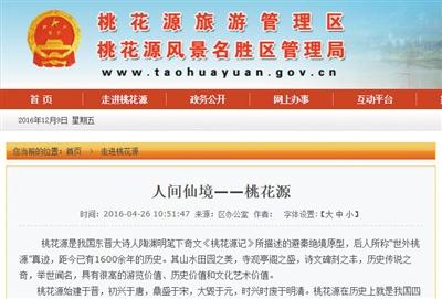 酉陽(yáng)桃花源旅游投資公司的官網(wǎng)顯示,酉陽(yáng)桃花源位于縣城近郊大山之中,是國(guó)家5A級(jí)旅游景區(qū),“被廣泛認(rèn)為是陶淵明筆下《桃花源記》原型地”。而酉陽(yáng)縣旅游局辦公室一名工作人員亦宣稱,陶淵明筆下的桃花源位于酉陽(yáng)縣,“是一種共識(shí)”。