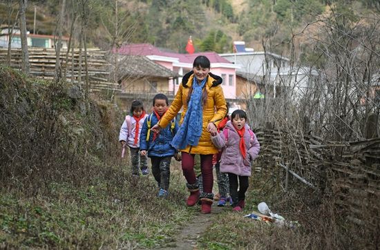 支月英沿著山路送學(xué)生們回家。