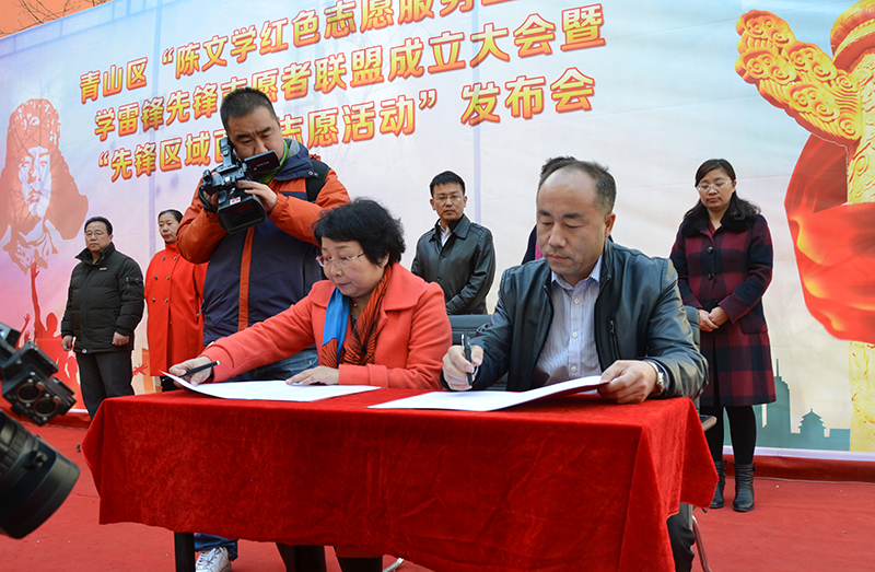 大地合唱團(tuán)紅歌聯(lián)唱拉開了活動(dòng)的序幕。云曉燕書記宣讀關(guān)于成立“陳文學(xué)紅色志愿服務(wù)工作室學(xué)雷鋒先鋒志愿聯(lián)盟”的決定。為更好依托陳文學(xué)工作室及轄區(qū)內(nèi)的志愿服務(wù)團(tuán)隊(duì),先鋒道街道黨工委根據(jù)各社區(qū)實(shí)際情況制定全年志愿服務(wù)計(jì)劃特制定了“百次志愿服務(wù)活動(dòng)”,活動(dòng)現(xiàn)場志愿者代表簽名。同時(shí),為繼承和弘揚(yáng)志愿服務(wù)精神,先鋒道街道與各高校簽訂志愿服務(wù)實(shí)習(xí)協(xié)議,為有志愿服務(wù)理想的大學(xué)生提供展示的機(jī)會(huì)和平臺(tái)。會(huì)上,最美黨員陳文學(xué)作為志愿者代表宣讀倡議書,傳遞雷鋒精神,號召更多的人加入志愿服務(wù)的隊(duì)伍,幫助別人,奉獻(xiàn)自己。