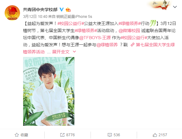 今年,王源、許魏洲、楊千嬅等眾多明星成為本屆活動(dòng)的校園公益大使。明星大使通過短視頻號(hào)召大家加入到綠植領(lǐng)養(yǎng)活動(dòng),在校園中踐行公益,截止目前王源、楊千嬅、包貝爾、劉璇的四條短視頻播放量近1000萬次。在線上活動(dòng)啟動(dòng)當(dāng)天,@TFBOYS-王源 3月12日發(fā)布自己擔(dān)任校園公益行公益大使的微博,該條微博互動(dòng)量超過642萬,轉(zhuǎn)發(fā)量突破607萬。明星名人在公益推廣上發(fā)揮著巨大的作用,據(jù)微博數(shù)據(jù)顯示2016年微博明星名人發(fā)布的公益話題閱讀量超過300億次,本次校園公益行邀請(qǐng)王源、許魏洲等在學(xué)生群體中有眾多粉絲和巨大影響力的明星作為公益大使,充分調(diào)動(dòng)了學(xué)生群體參與公益的積極性,讓大家自發(fā)參與到公益活動(dòng)中。