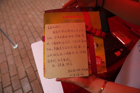 圖注:愛(ài)心市民在書上寄語(yǔ)山區(qū)孩子