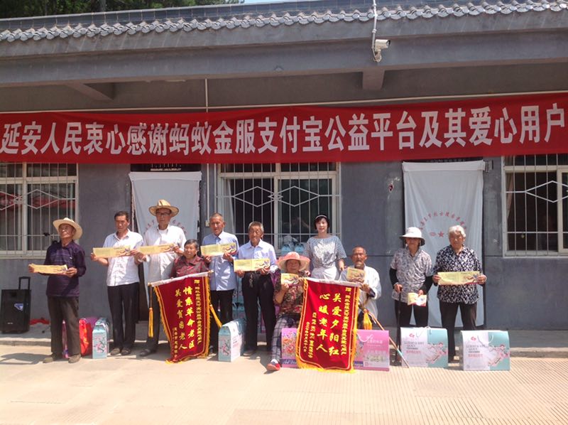 為幫助老區(qū)人民精準(zhǔn)扶貧脫貧,2017年6月29日,中國老齡事業(yè)發(fā)展基金會與螞蟻金服支付寶公益平臺在陜西省延安市富縣舉辦“孤老救助大行動”公益項目捐贈活動,為延安市富縣、志丹、洛川、延川等貧困縣區(qū)1.5萬名孤老及貧困老人捐贈意外傷害救助公益保險,醫(yī)療救助保障總金額達(dá)4.5億元,充分體現(xiàn)螞蟻金服支付寶公益平臺情系革命老區(qū)、關(guān)愛貧困老人的高尚情懷,樹立了螞蟻金服支付寶愛老助老的公益品牌形象;顒悠陂g,中國老基會代表螞蟻金服支付愛心用戶走訪慰問了部分老紅軍戰(zhàn)士、孤老以及貧困老人,為他們捎去社會各界愛心人士的真情關(guān)愛與美好祝福,祝老人們健康長壽,幸福平安快樂安度晚年。