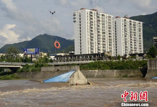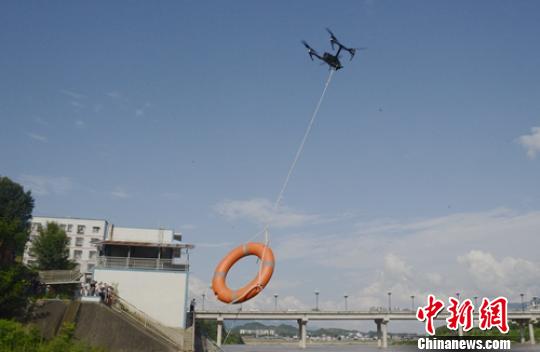 無人機(jī)向被困者投送救生圈!$娦 攝