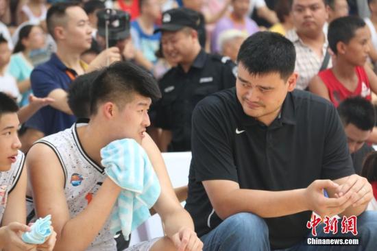 資料圖 姚明與小球員們交流。鐘欣 攝