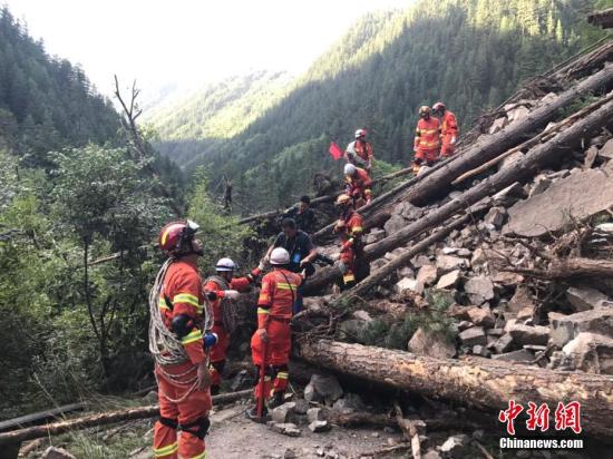 8月9日下午16時左右,德陽消防14名黨員突擊隊員徒步行軍10余公里,歷時3小時到達洛日朗附近一帶搜索被困群眾,期間余震不斷,大小石頭不斷的從山上滾下來,救援官兵把生死拋開,寸步難行的在山間搜尋。 圖片來源:四川消防供圖