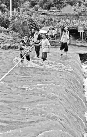 洪水沖毀了龍泉峪村連接外界的唯一橋梁,第一書記肖學(xué)成和村干部找來繩索,固定河道中的一棵大樹后進村救人。村民們背著包,志愿者們背著老人,一趟一趟轉(zhuǎn)移。