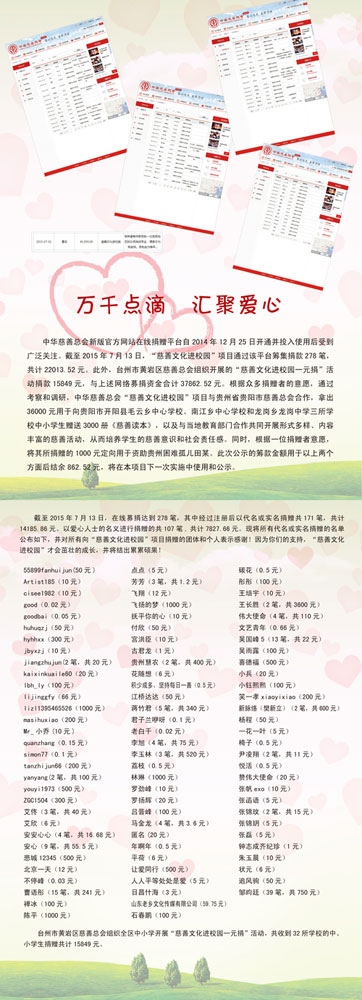 中華慈善總會新版官方網(wǎng)站在線捐贈平臺自2014年12月25日開通并投入使用后受到廣泛關(guān)注。截至2015年7月13日,“慈善文化進(jìn)校園”項目通過該平臺籌集捐款278筆,共計22013.52元。此外,臺州市黃巖區(qū)慈善總會組織開展的“慈善文化進(jìn)校園一元捐”活動捐款15849元,與上述網(wǎng)絡(luò)募捐資金合計37862.52元。根據(jù)眾多捐贈者的意愿,通過考察和調(diào)研,中華慈善總會“慈善文化進(jìn)校園”項目與貴州省貴陽市慈善總會合作,拿出36000元用于向貴陽市開陽縣毛云鄉(xiāng)中心學(xué)校、南江鄉(xiāng)中心學(xué)校和龍崗鄉(xiāng)龍崗中學(xué)三所學(xué)校中小學(xué)生贈送3000冊《慈善讀本》,以及與當(dāng)?shù)亟逃块T合作共同開展形式多樣、內(nèi)容豐富的慈善活動,從而培養(yǎng)學(xué)生的慈善意識和社會責(zé)任感。同時,根據(jù)一位捐贈者意愿,將其所捐贈的1000元定向用于資助貴州困難孤兒田某。此次公示的籌款金額用于以上兩個方面后結(jié)余862.52元,將在本項目下一次實施中使用和公示。